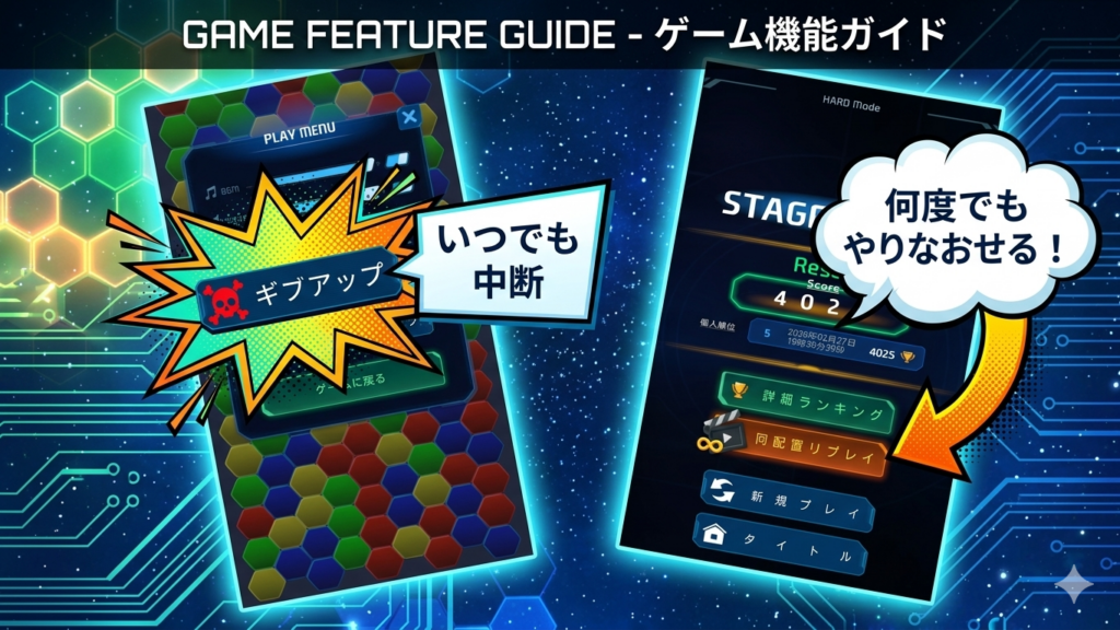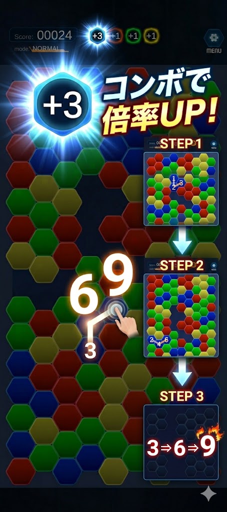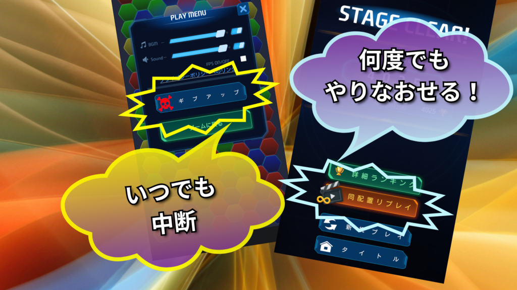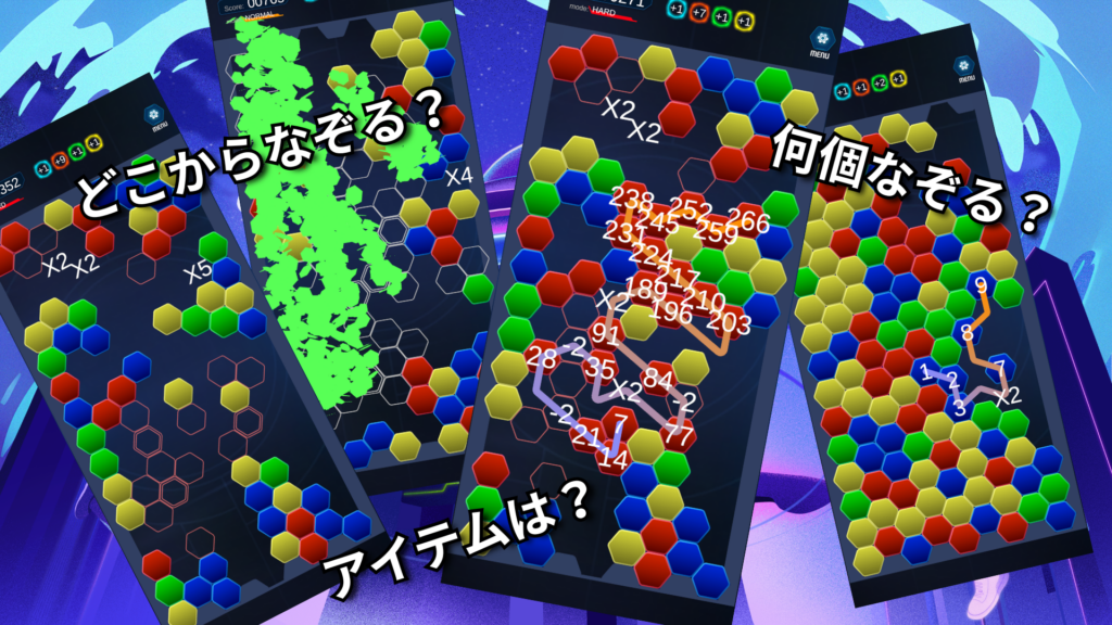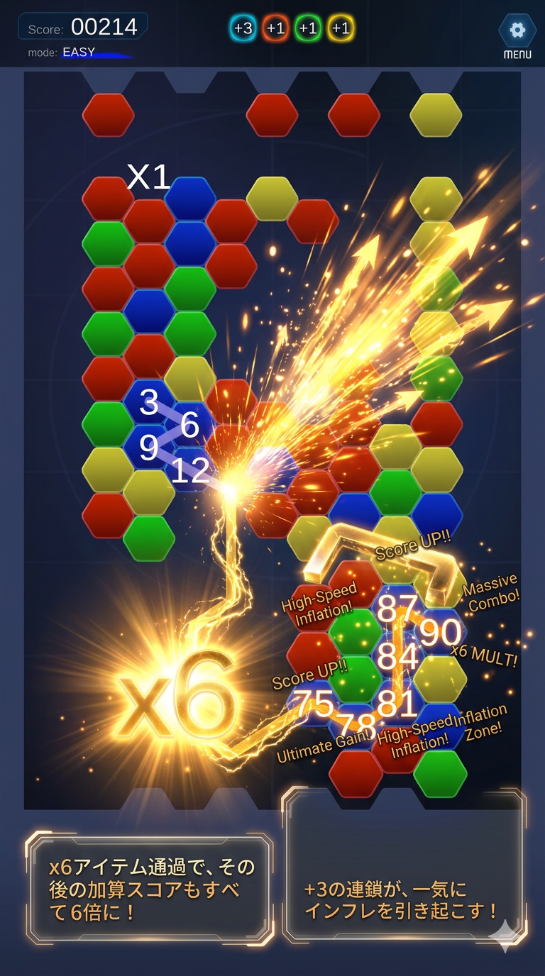 なぞるたびに得点が2倍、3倍……と指数関数的に増加。さらに同色ボーナスを重ねれば、見たこともない桁数のスコアが画面を埋め尽くします。